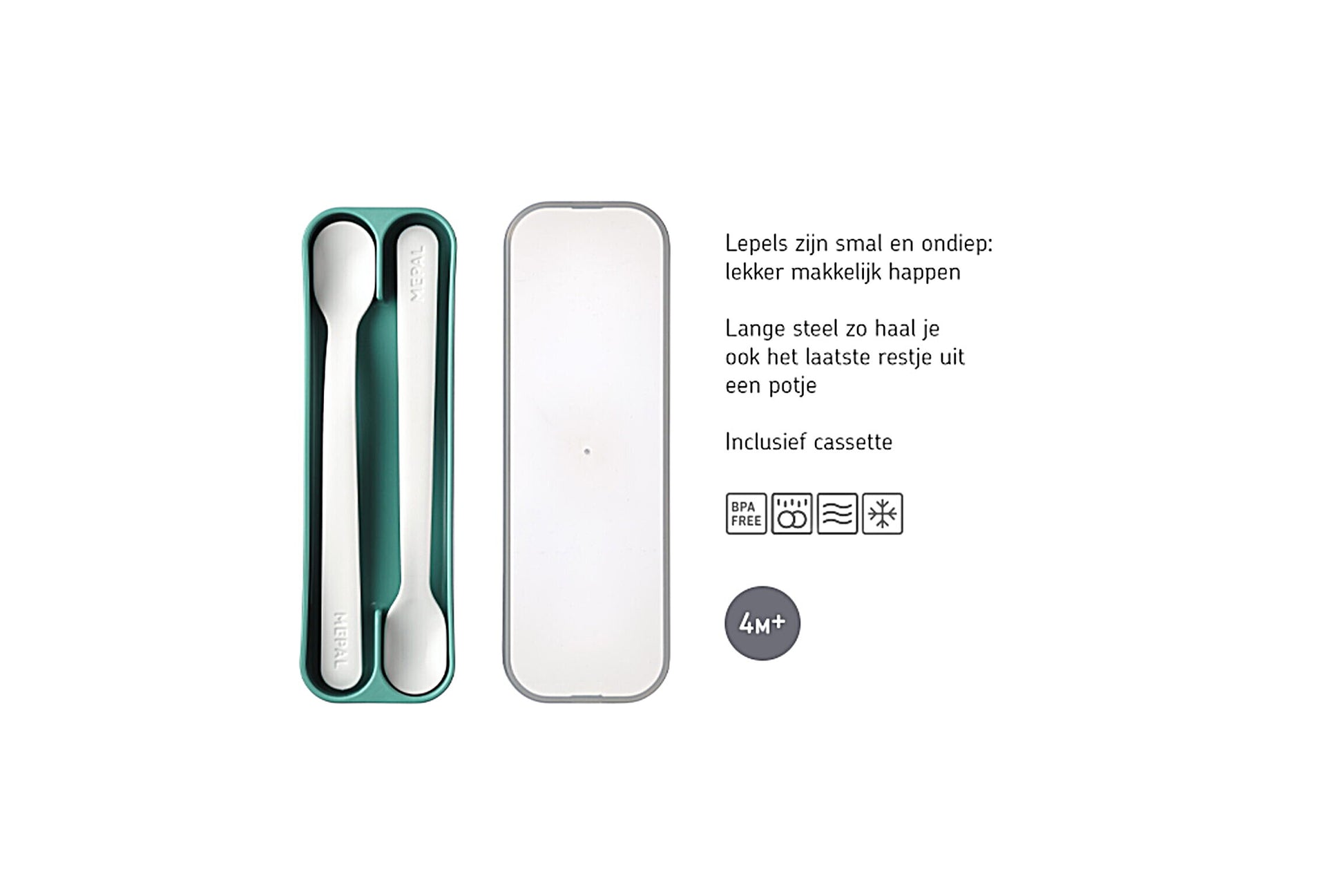 - Lepels zijn smal en ondiep, voor de eerste hapjes.