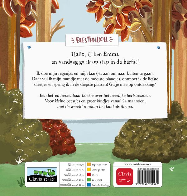 Hallo, ik ben Emma en vandaag ga ik op stap in de herfst! Ik doe mijn regenjas en mijn laarsjes aan om naar buiten te gaan. Daar vul ik mijn mandje met de mooiste blaadjes, ontmoet ik de liefste diertjes en spring ik in de diepste plassen! Ga je mee op ontdekking? Een lief en herkenbaar boekje over het heerlijke herfstseizoen. Voor kleine beestjes en grote kindjes vanaf 24 maanden, met de wereld rondom het kind als thema.