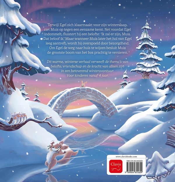 Terwijl Egel zich klaarmaakt voor zijn winterslaap, ziet Muis op tegen een eenzame kerst. Net voordat Egel indommelt, fluistert hij een belofte: ‘Ik zal er zijn, Muis. Dat beloof ik.’ Maar wanneer Muis later het hol van Egel leeg aantreft, wordt hij overspoeld door bezorgdheid. Om Egel de weg naar huis te wijzen besluit Muis de grootste boom van het bos prachtig te versieren. Dit warme, winterse verhaal verweeft de thema’s van belofte, vriendschap en de kracht van alleen zijn in een betoverend winteravontuur. Voor kinderen vanaf 4 jaar.