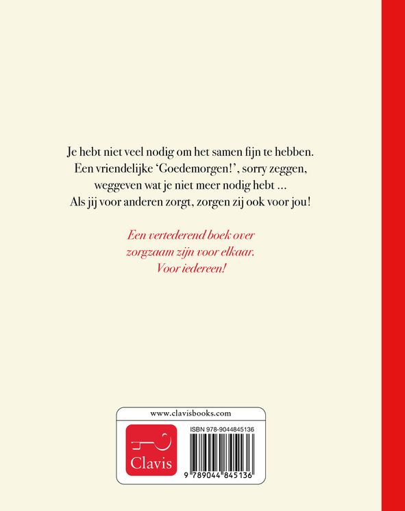 Een vertederend boek over zorgzaam zijn voor elkaar. Voor iedereen! Je hebt niet veel nodig om het samen fijn te hebben. Een vriendelijke ‘Goedemorgen!’, sorry zeggen, weggeven wat je niet meer nodig hebt … Als jij voor anderen zorgt, zorgen zij ook voor jou!