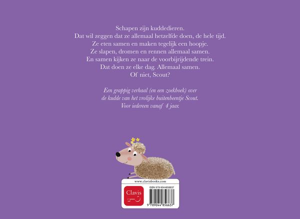 Schapen zijn kuddedieren. Dat wil zeggen dat ze allemaal hetzelfde doen, de hele tijd. Ze eten samen en maken tegelijk een hoopje. Ze slapen, dromen en rennen allemaal samen. En samen kijken ze naar de voorbijrijdende trein. Dat doen ze elke dag. Allemaal samen. Of niet, Scout? Een grappig verhaal (en een zoekboek) over de kudde van het vrolijke buitenbeentje Scout. Voor iedereen vanaf 4 jaar.